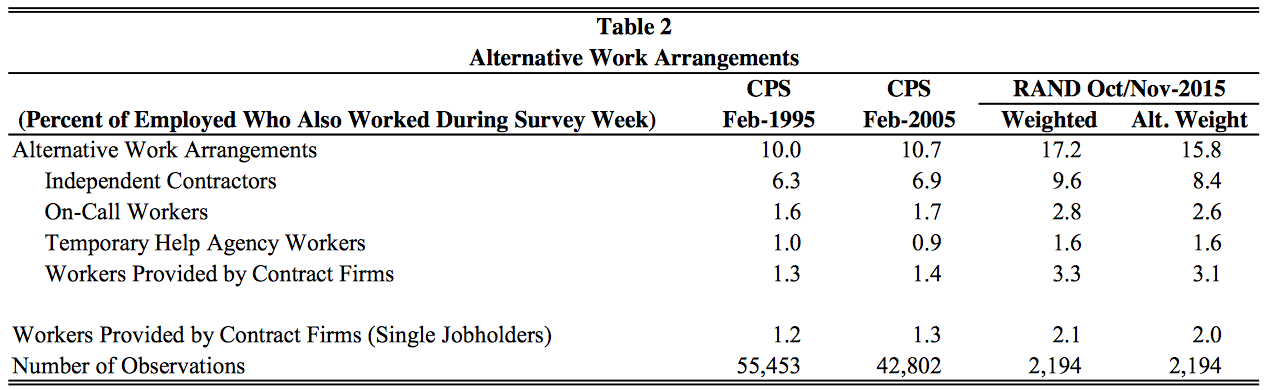 Since 2005, the Bureau of Labor Statistics has not been able to conduct its Contingent Work Survey or CWS, the main instrument used to track alternative (i.e. non-traditional) work relationships in the U.S. To complete their analysis, the authors contracted with the RAND Institute to create the a survey that would mimic the BLS’s CWS. As such, they created the RAND-Princeton Contingent Workers Survey (RPCWS) and used it to measure how the employment environment has changed over the years from 2005 to 2015.