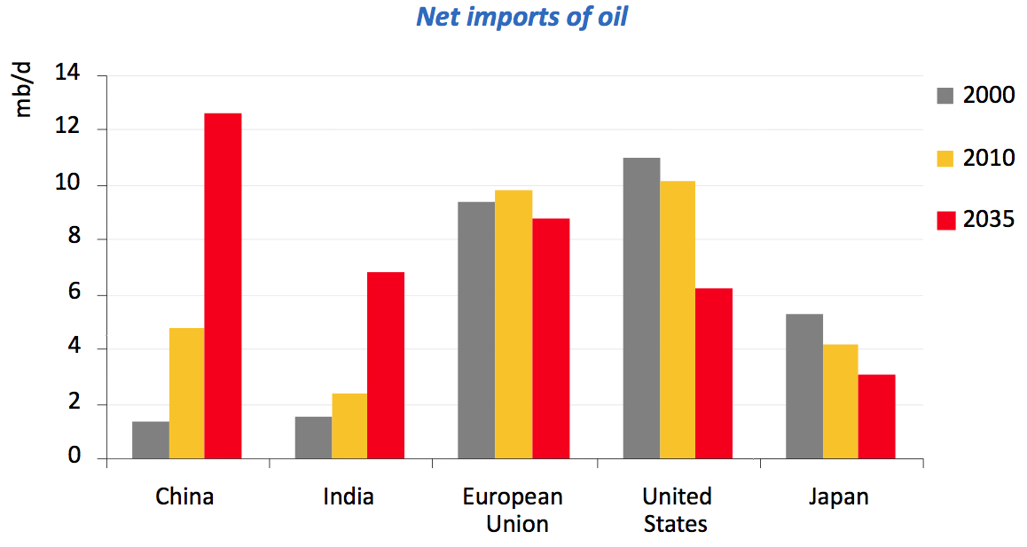 Now, let’s focus on oil.  By 2020, China is projected to take over first place from the United States as the world’s largest oil importer and by 2035, it is anticipated that China will import over 12 million BOPD.  By 2035, 80 percent of the oil consumed in non-OECD Asia is sourced from imports, up from just over 50 percent in 2010.  This is largely due to natural declines in domestic Asian production.   By 2015, even the EU nation states will import more oil than the United States, largely because of rising U.S. oil output from tight formations (think fracking) and improved efficiency.  Here is a graph showing the changes in oil imports for the next 25 years: