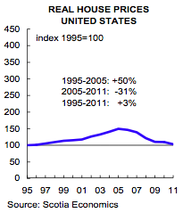 Between 1995 and 2005, the United States saw real price growth of 50 percent in its housing market. A sharp reversal in 2006 has resulted in cumulative downward price readjustment of 31 percent with a year-over-year drop of 7.5 percent in the third quarter of 2011. Unfortunately, a stagnant job market, oversupply of foreclosures and unsold homes and tight credit conditions have led to a very moribund housing market. Here is a graph showing the slump in the leading U.S. housing indicators: