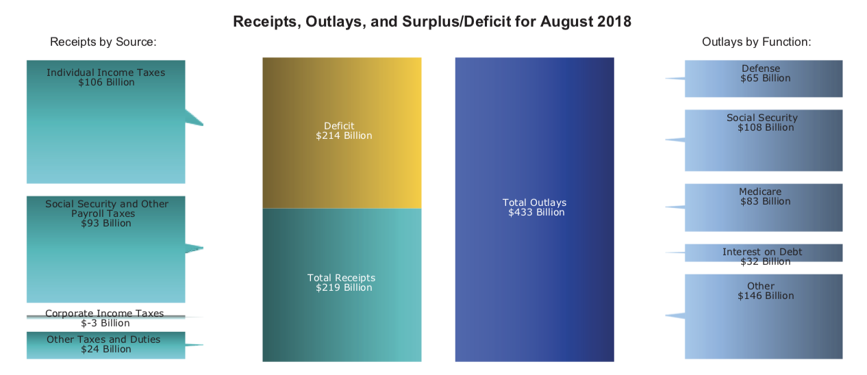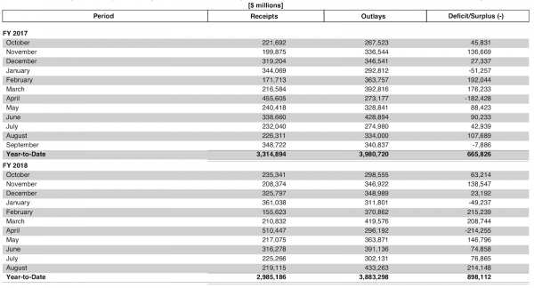 The most recent Monthly Treasury Statement from the Treasury Department for the month ending August 31, 2018 shows that little has changed under the new guard: