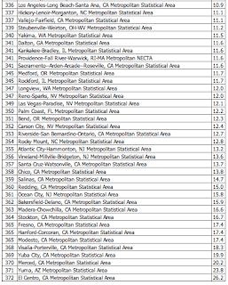 3.) Of the 30 best-performing housing markets in the fourth quarter of 2011, 13 had unemployment rates of less than 7 percent. For interest's sake, here is a screen capture showing the metropolitan areas in the United States that had unemployment in excess of 9.5 percent in March 2012: