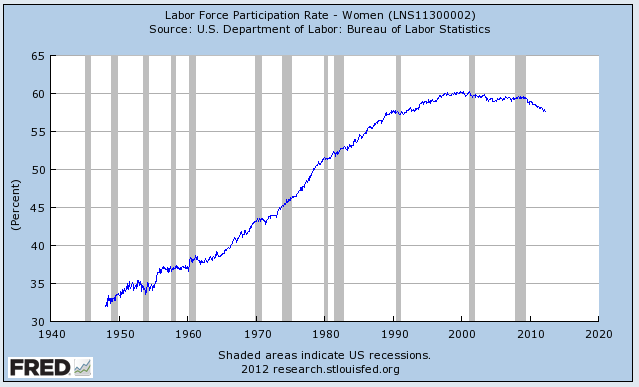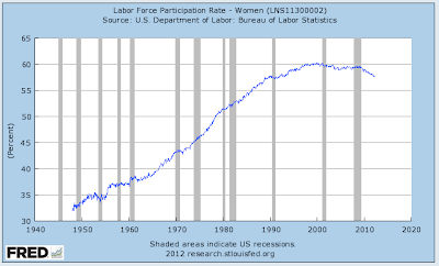 Back in the late 1940s when men's participation rate was peaking, only 33 percent of women were in the workforce. Women's participation rate peaked at 60.3 percent in April 2000 and has slowly fallen to 57.6 percent in April 2012, a drop of only 4.5 percent.