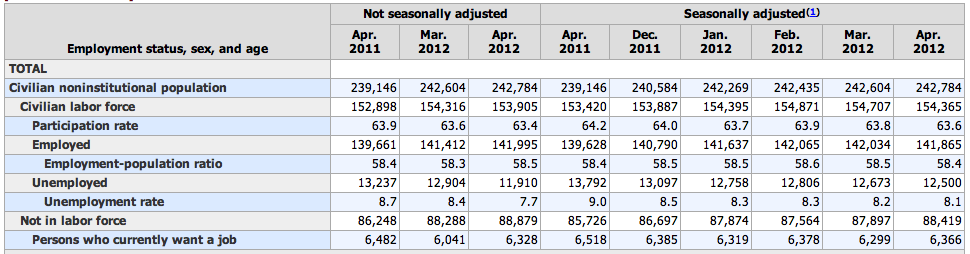 Staff at the Federal Reserve have calculated that if the labor force participation rate had remained constant from March to April of 2012 instead of falling, that the unemployment rate would actually have risen to 8.4 percent rather than falling to 8.1 percent.
