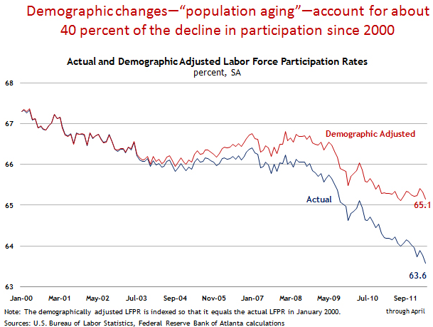 Why is the labor force participation rate falling? Many people feel that the current job market is so poor that unemployed Americans are simply giving up and falling off the Bureau of Labor Statistics' radar. Mr. Altig notes that at least some of the decline in the participation rate is due to population aging as older workers retire and remove themselves from the workforce. Here is a chart from the article showing the impact of demographic changes on the labor force participation rate: