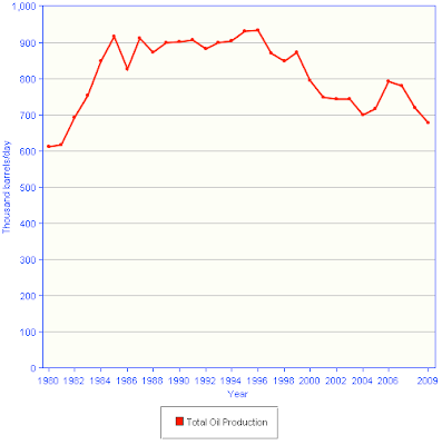 Until 2009, Egypt actually exported much of its oil, however, that has changed as domestic energy demand has increased. Here is a graph showing how much oil Egypt has produced in BOPD for the last 30 years ranking 26th place in the world: