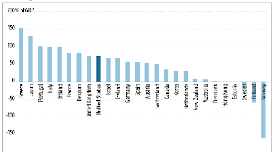 Please keep in mind that the difference between gross and net public debt statistics refer to that particular government's financial assets which are subtracted from gross public debt to give us net public debt. In the case of Japan, its gross public debt in 2010 was 220 percent of GDP but, thanks to large assets, its net public debt is "only" 117 percent of GDP. In sharp contrast, Greece's gross government debt and net government debt were both 143 percent of GDP in 2010 since the Greek government has no assets.