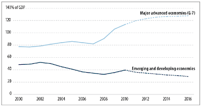 Sovereign debt levels for the G-7 economies rose from 84 percent of GDP prior to the Great Recession to 114 percent of GDP in 2010 and are projected to rise to 127 percent of GDP by 2016, an increase of 51 percent over 10 years. In sharp contrast, debt levels in developing economies fell from 52 percent of GDP in 2002 to 39 percent of GDP in 2010 and are projected to fall even further to 29 percent of GDP by 2016, a decrease of 44 percent over 14 years.