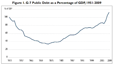 Let's start by looking at several graphs from the report. The first graph shows the changes in the gross public debt levels for the G-8 nations since the end of World War II: