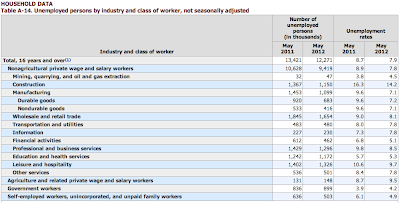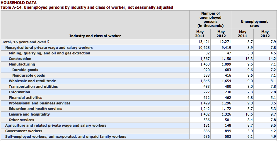 Here is a screen capture from the Bureau of Labor Statistics website showing the non-seasonally adjusted unemployment rates for various industries, including government, for May 2012, comparing rates from one year earlier: