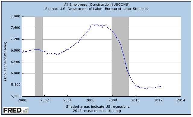 That single private sector has seen job losses of 28.6 percent or 2.21 million workers since construction employment peaked in the spring of 2006.