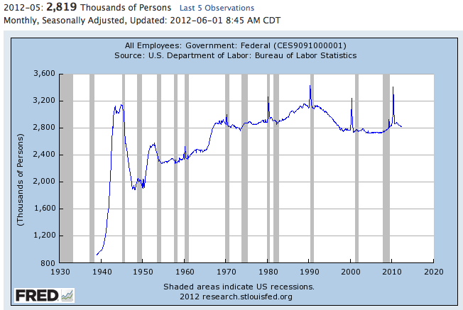 Other than the one-month blip to 3.4 million in May 2010, the number of Federal government employees has been stable at between 2.7 and 2.9 million since the late-1990s.