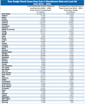 A recent study by the Centre on Budget and Policy Priorities has taken a deeper look at the Paul Ryan Budget in a report entitled "Deficit-Reduction Package That Lacks Significant Revenues Would Shift Very Substantial Costs to States and Localities". In this report, CBPP looks at how a federal budget that cuts deficits without increasing revenue would make deep cuts in funds that support both state and local governments. It is these lower levels of government that provide us with the everyday services that taxpayers use; education, our roads and bridges and law enforcement among others services.