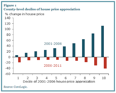 Since the Great Recession and the collapse in housing prices in 2006, as I noted above, households experienced a "wealth shock". This graph shows that in counties where real estate prices increased the most between 2001 and 2006, saw the greatest house price decreases during the 2006 to 2011 bust: