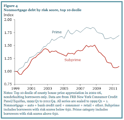 Among non-defaulting mortgage borrowers in real estate markets that experienced house price increases in the top ten percent between 2001 and 2006, the non-mortgage debt loads of subprime borrowers rose in pace with and then fell much more quickly during the Great Recession than their prime borrower counterparts as shown here: