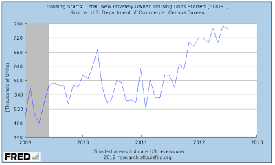 Recent data releases are showing some improvement in America's much beleaguered housing market, including single-family home starts which were up 2.3 percent in August to an annual rate of 750,000. This is the very close to the strongest pace in more than two years as shown on this chart from FRED:
