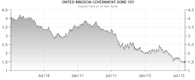 In the United Kingdom, since 2008, interest rates on 10 year bonds have also dropped from 4 percent to 1.5 percent as shown here: