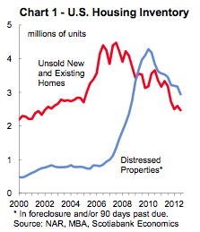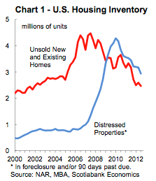 Sales are down 10 percent from "normal levels", however, the increasing number of sales to international buyers in recent months is contributing to the upside in the market. Interestingly, 24 percent of international buyers hail from Canada and 11 percent are from China. As you can see on this graph, the number of foreclosures (in blue) and the inventory of unsold homes (in red) are dropping with the inventory hitting decade-low values: