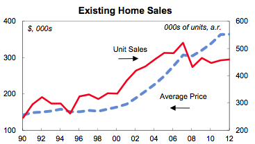 Here is a graph showing the number of existing home sales (in red) and the average price (in blue) for all of Canada since 1990: