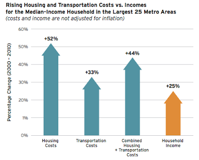 Despite the fact that the nation's housing market showed a marked decline in prices over the 2006 to 2010 period, housing expenses were 52 percent higher than they were in 2000.  Transportation expenses also rose as suburban development took precedence over inner-urban development, pushing transportation costs up 33 percent.  In combination, housing and transportation costs for households rose by 44 percent over the period from 2000 to 2010, up 19 percentage points over household income which rose only 25 percent as shown on this graph: