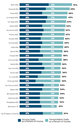 Let's open with a bit of background information to help you put the conclusions of this study into context.  In this study, the Center for Housing Policy examines the housing and transportation cost burdens for moderate-income households in the nation's 25 largest metropolitan areas and gives insight into the impact of the rapid rise and fall of home prices during the last decade.  Included in housing costs are rent and utilities for renters, mortgage payments, property taxes, insurance, utilities, condo fees and payments for home equity loans for home owners.  Transportation costs include all the trips that a household makes as part of its daily routine and includes the cost of car payments, insurance, maintenance and fuel for car owners and the price of transit for those who do not own a car.  Data for this study was gleaned from the American Community Survey conducted by the United States Census Bureau for the years 2006 to 2010 and all prices are adjusted to 2010 dollars.  Moderate income households are defined as those households that earn between 50 and 100 percent of a metro area's median income, ranging from a low of $23,956 to $47,912 in Tampa to a high of $44,531 to $89,063 in Washington, D.C.  The average moderate income household for all 25 metropolitan areas was $44,566.