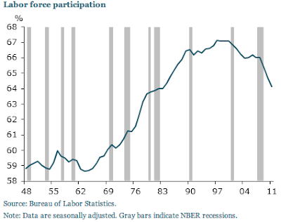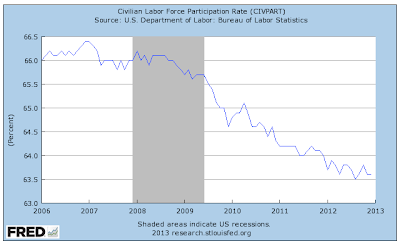 Here is a graph showing the rather steep drop in the labour force participation rate since the Great Recession: