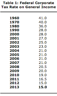 As background, the corporate tax rate in Canada was 28 percent back in 2000 and was lowered until it reached 21 percent under Paul Martin's watch. Under the leadership of the Harper government, the tax has been cut in stages to its current level of 15 percent. On top of that, the provincial component of corporate taxes has also been lowered with the combined provincial/federal tax rate falling from 40.5 percent in 2001 to 27.8 percent in 2011 and is projected to fall to 25 percent over the coming years.