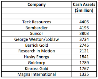 Here are the top ten Canadian companies in order of size of cash reserves from greatest to smallest for 2011: