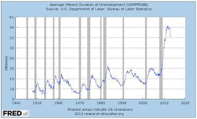 Looks pretty good, doesn't it? The way that the mean duration of unemployment dropped in late 2012 is a thing of beauty! The mean dropped from a high of 40.7 weeks in November and December of 2011 to its current mean of 35.3 weeks, a drop of 5.4 weeks in one short year. Amazing! Outstanding! Congratulations to all involved.