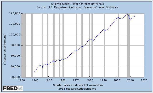 Now, let's look at the total number of non-farm employees for roughly the same periods of time as we looked at corporate profits and compare growth levels.