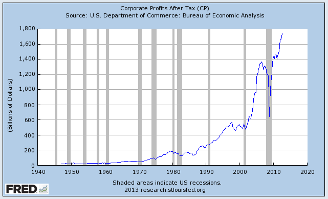 In mid-2012, after-tax corporate profits were $1742 billion.  That's an increase of 171 percent in four years and, over the 10 year period from the previous peak in mid-2007, its a still a respectable increase of 33 percent over a five year period even when the Great Recession profit retrenchment is included.