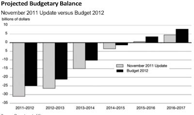 Now, let's look at Mr. Flaherty's most recent budget, delivered on March 29, 2012. In this budget, Economic Action Plan Part Umpteen, Mr. Flaherty now proposed that the deficit would continue to decline to $1.3 billion in fiscal 2014 – 2015. The federal debt was projected to decline to 28.5 percent of GDP in 2016 – 2017, still well above the 25 percent mark proposed for fiscal 2013 – 2014.