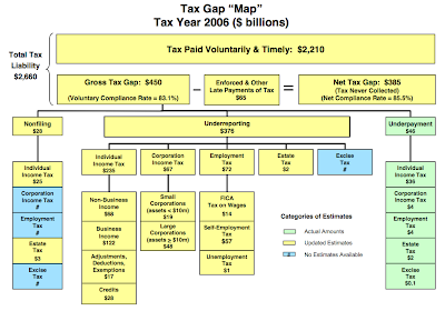 Here is a flow chart showing which taxable parts of the economy are responsible for the tax gap and how big the tax losses were in 2006: