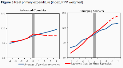 First, government expenditures, used to stimulate moribund economies, in the advanced and emerging economies are very different this time as shown on these these graphs: