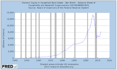Current homeowners' equity (i.e. the "skin that they have in the game") in real estate for the fourth quarter of 2012 was $8.223 trillion. This is down 38.9 percent or $5.245 trillion from its peak of $13.468 trillion in the first quarter of 2006.
