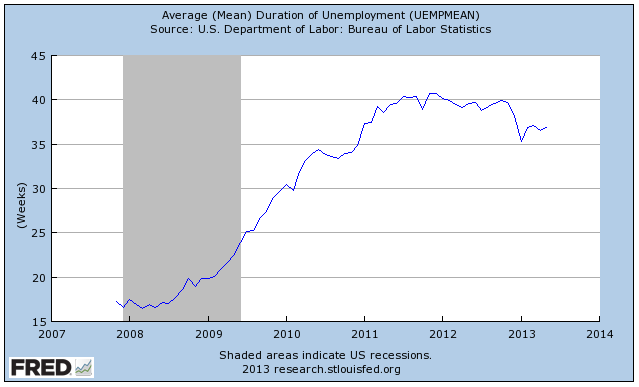 In November 2007, the average American worker was unemployed for a period of only 17.3 weeks before finding a new job opportunity. Four years into the recovery, an average American finds himself or herself without work for 36.9 weeks, over twice as long as before the Great Recession.