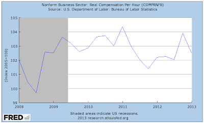 Here is a look at our personal bottom line, showing what has happened to real hourly compensation since November 2007:
