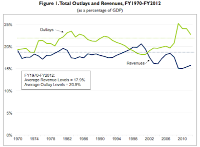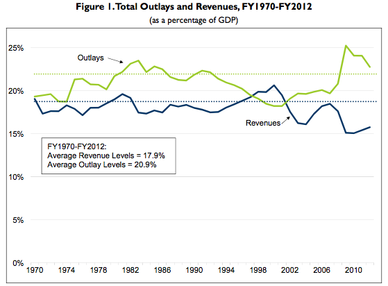 Over the past 40 years, on average, federal spending has averaged 21 percent of GDP while revenues have averaged only 18 percent of GDP, resulting in a string of deficits since the early years of the new millennium. Here is a graph showing how, since 1970, outlays (in green) have outstripped revenues (in blue) for most of the past 40 years: