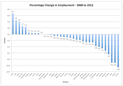 Here's how the change in the United States employment rate between 2008 and 2012 looks compared to its OECD counterparts (in descending order):