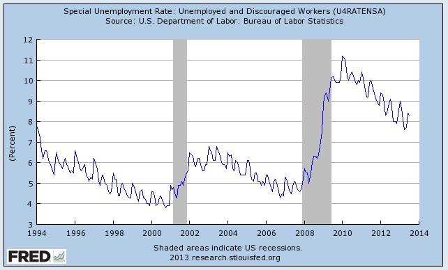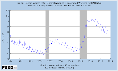 As shown on this graph, the unemployment situation in America looks far worse than the headline number if you add the total number of unemployed to the number of discouraged workers (currently standing at 988,000 in June 2013):