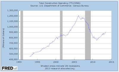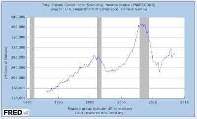 The last data point for July 2013 was $900 million, up from the post-Great Recession low of $760 million but just back at the levels last seen in 2003 and well below the pre-Great Recession peak of $1.2 trillion. Given that interest rates are at multi-generational lows, you would think that investing in new construction, particularly on the non-residential side, would be growing by leaps and bounds, however, as shown here, that is quite clearly not the case: