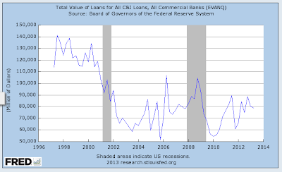 3.) Commercial and Industrial Loans: Here's an interesting graph that we don't normally see showing the value of all commercial and industrial loans by all commercial banks: