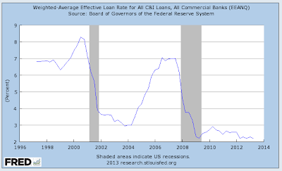 While the value of loans is now back in the range of what it was before the Great Recession, it is well below the value seen in the years before the recession in 2001 and about on par with the value seen before the Fed started its wholesale fiddling with the economy. In fact, given that the Fed's ultra-low interest rate policy was crafted to stimulate borrowing, we can see that it has been quite a failure on that front particularly since this is what the average effective commercial and industrial loan interest rate looks like: