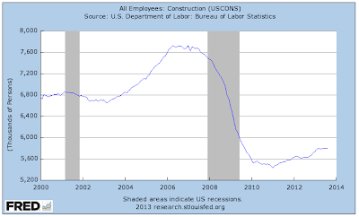 The last data point for July 2013 was $900 million, up from the post-Great Recession low of $760 million but just back at the levels last seen in 2003 and well below the pre-Great Recession peak of $1.2 trillion. Given that interest rates are at multi-generational lows, you would think that investing in new construction, particularly on the non-residential side, would be growing by leaps and bounds, however, as shown