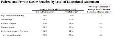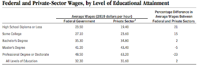 Private sector workers with a high school diploma or less are earning 21 percent less than equivalent workers in the federal government. Even private sector workers with a Bachelor's Degree are seeing a 2 percent penalty compared to their federal counterparts. The biggest gains in the private sector over the federal government are not seen until one has a Professional Degree or PhD; for these individuals who are working in the private sector, there is a 23 percent wage premium over their federal government counterparts.