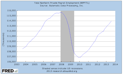 The number of total non-farm, private sector employees is still 1.68 million or 1.45 percent below its pre-Great Recession peak, having dropped from a peak of 115.66 million in December 2007 to its nadir of 106.9 million in January 2010, a fall of 7.6 percent. In contrast, over the same time frame, the number of federal government workers was at a level that was higher than its pre-recession level for the entire five year period from the beginning of 2008 to the end of 2012.