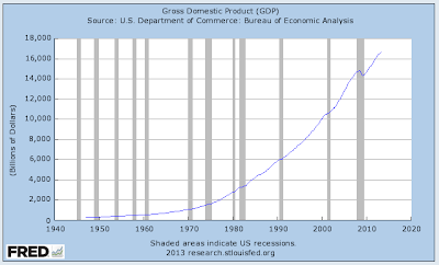 Since the beginning of the Great Recession in December 2007, nominal GDP has grown from $14672.9 billion to its current level of $16661 billion, an increase of only 13.5 percent. Note that the growth in M2 has far outstripped the growth in nominal GDP.