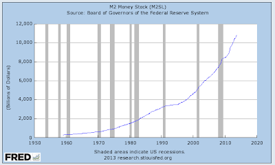 Since the beginning of the Great Recession in December 2007, the M2 money supply has grown from $7450.8 billion to its current level of $10818.5 billion, an increase of 45.2 percent. There must have been a lot of late nights at the Federal Reserve, "printing" all of that money!