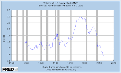 Now, why should we be concerned about all of this? Right now, the velocity of money is very low meaning that all the money that the Fed is "printing" is not being spent as many times as it normally would as shown on this graph: