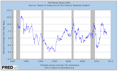 While the growth in M2 was not as dramatic as the growth in M1, it still grew at an elevated rate of around 10 percent for a nine month period between August 2011 and June 2012 and has since dropped back to the still rather high level of 6.7 percent on a a year-over-year basis.