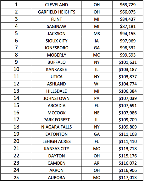In contrast to California, the now de-industrialized U.S. Midwest has 15 of the nation's 25 least expensive real estate markets with Cleveland, Ohio having the least expensive four-bedroom, two-bathroom homes listing for an average price of only $63,729. Cleveland took over from last year's least expensive market Redford, Michigan where an average home listed for a very affordable $60,490.